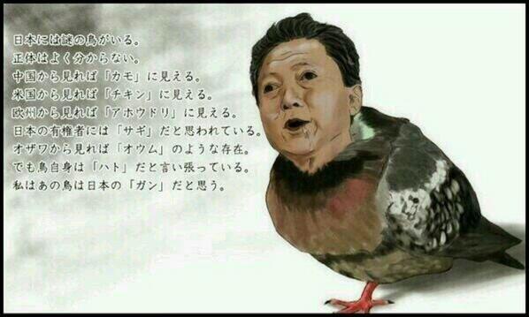 June 26, 2014 日本に住む謎の鳥 ツイッター上で見つけた。ちょっと使わせてもらいます。著作権侵害だ、なんて怒らないでね。 日本には謎の鳥がいる。 正体はよく分からない。 中国から見れば「カモ」に見える。 米国から見れば「チキン」に見える。 欧州から見れば「アホウドリ」に見える。 日本の有権者には「サギ」だと思われている。 オザワから見れば「オウム」のような存在。 でも鳥自身は「ハト」だと言い張っている。 私はあの鳥は日本の「ガン」だと思う。 こんなヤツに例えられると、「鳥たち」も悲しんでいるんじゃない? < 前の記事次の記事 > コメント コメントフォーム 名前 コメント 記事の評価 リセット リセット 顔 星 情報を記憶 コメントを投稿する