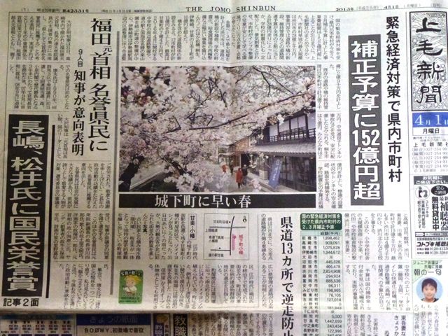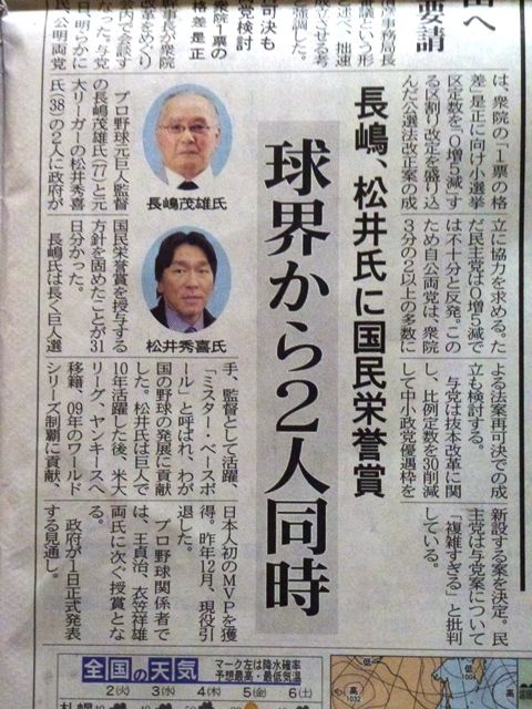 4月1日、政府は長嶋茂雄と松井秀喜への国民栄誉賞授与を発表した。その4月1日の朝刊で、このネタを上毛新聞がスクープしていた。