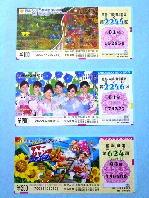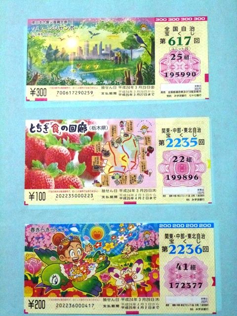 August 27, 2012 宝くじコレクション5 宝くじ券を集め出して、丸2年が経った。最初は「ハズレ券」と言っていたのだが・・・。 やっぱり「ハズレ券」って言い方は良くなかったようだ。去年の年末ジャンボで、1等組違いの10万円が当たってから、さっぱりツキに見放されている。 ということで、「宝くじ券」! では、前回以降分だよ。 関・中・東2246回に登場は、平成24年度の幸運の女神。来年の3月まで、よろしくお願いします。 < 前の記事次の記事 > コメント コメントフォーム 名前 コメント 記事の評価 リセット リセット 顔 星 情報を記憶 コメントを投稿する
