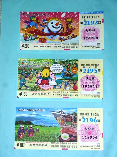 ジャンボ宝くじがあまりに当たらないので、関・中・東なども含めて、はずれ券を集めだしてはや1年。集めるというよりも、1枚だけ捨てないでとってある、という表現の方が正しい。