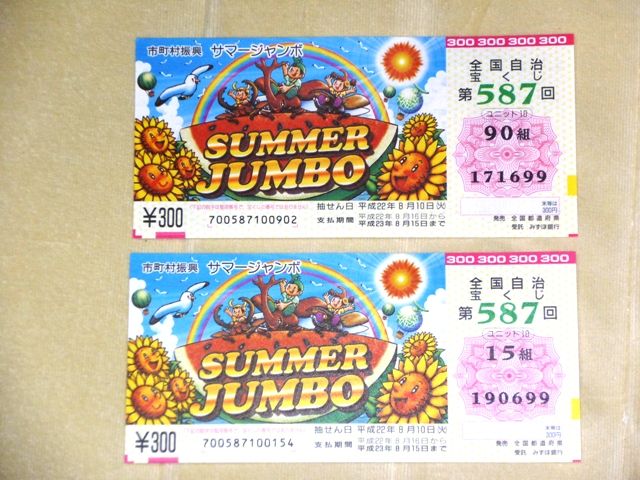 August 10, 2010 億万長者への道は・・・・・遠し サマージャンボで1万円が2本当たった! でも、夢は大きく億万長者だったので、嬉しいような残念なような。まあ、1万円が2枚当たったことは良しとするが、全体を見れば赤字だし。高額当選に対しては、惜しいのおの字もなかったし・・・。 さあ、次回のオータムジャンボを目指して、また今日から日夜研究に励もう。 この1万円×2本の他、当選金の全ては、オータムジャンボにつぎ込むのは、言うまでもない。 ところで、やっぱり1000万サマーは極悪だった。300円以外当たらなかったぞ!! < 前の記事次の記事 > コメント コメントフォーム 名前 コメント 記事の評価 リセット リセット 顔 星 情報を記憶 コメントを投稿する