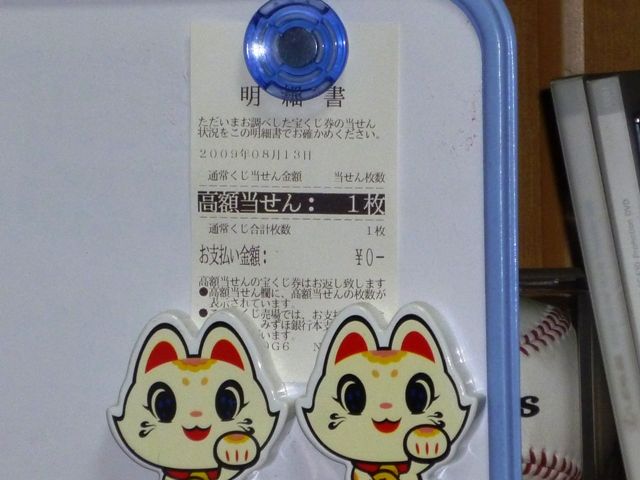 夢よもう一度、もっと高額当選を、ということで、毎回買っているのだが、赤字額が増えるばかり。縁起をかついで、こんなグッズまで買ってしまった。