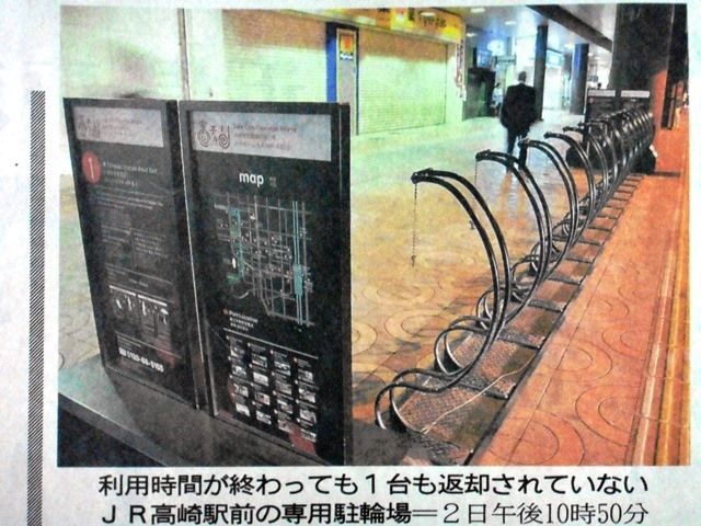 上毛新聞の調査によると、15ヶ所ある専用駐輪場に時間内に戻って来たのは、全150台中少ない日で7台だったという(5月連休中)。また、高崎駅周辺とされている利用エリアも守られず、前橋市で発見されたものもあるという。(写真は5月12日の上毛新聞から)