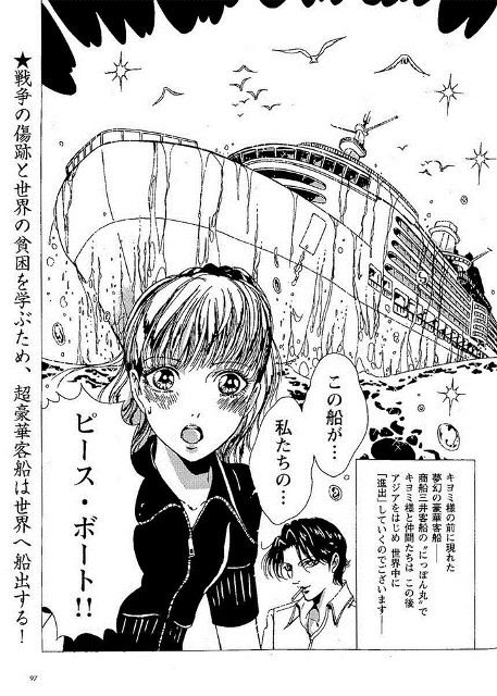 「戦争の傷跡と世界の貧困を学ぶため超豪華客船は世界へ船出する!」だそうだが、それより描かれている女性は辻元清美さまらしい(爆)。貧困と超豪華客船という対極の言葉に違和感があるけど・・・。