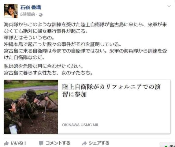 沖縄県宮古島市議・石嶺香織が自身のFBで「海兵隊から訓練を受けた陸上自衛隊が宮古島に来たら、米軍が来なくても絶対に婦女暴行事件が起こる。軍隊とはそういうもの」と投稿、大炎上している。