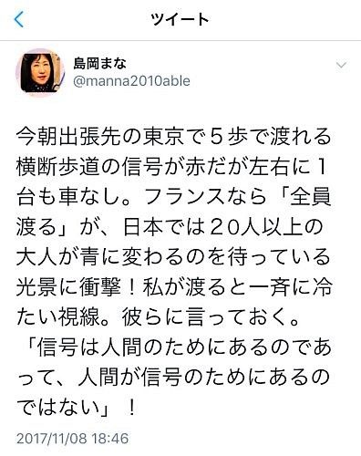 「今朝出張先の東京で5歩で渡れる横断歩道の信号が赤だが左右に1台も車なし。フランスなら全員渡るが、日本では20人以上の大人が青になるのを待っている光景に衝撃! 私が渡ると一斉に冷たい視線。彼らに言っておく。信号は人間のためにあるのであって、人間が信号のためにあるのではない!」