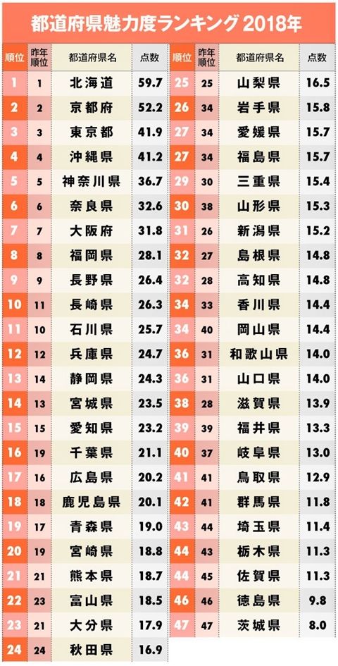 だいたいランキングが固定化されたイメージ。上位は北海道、京都府、東京都、沖縄県、神奈川県、奈良県、大阪府、福岡県、長野県あたりが一桁台。逆に鳥取県、群馬県、埼玉県、栃木県、佐賀県、徳島県、茨城県が連続の40位台。その中で、昨年40位の岡山県が34位に上がっている。ちょっと悔しい。