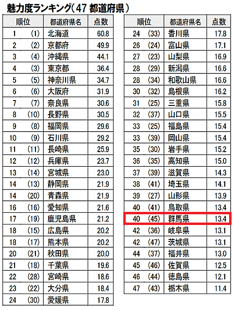実はこの40位という結果は、群馬県の過去最高位なのだ。従来は2010年と2017年の41位が最高だった。日本の都道府県数はご存じのように47。常に40位台をキープしており、安定感は抜群だ(苦笑)。
