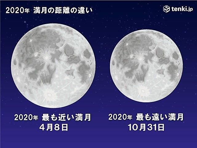 さらに、31日の満月は今年最小の満月。地球と月の距離が一番遠い満月のこと。もちろん肉眼やカメラのレンズ越しに見ても判別出来るレベルではないが、約14%大きさが違うという(イメージ図は日本気象協会から)。